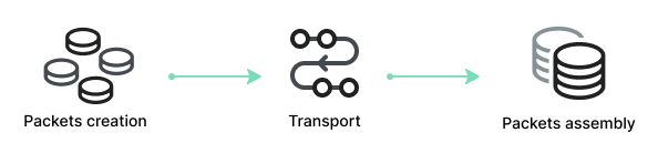 Saat data sudah terenkripsi, ciphertext tersebut akan diteruskan ke lapisan-lapisan berikutnya. Proses ini membuat ciphertext dibungkus secara bertahap oleh PDU tiap lapisan: dimulai dari segment di Transport Layer, lalu menjadi packet di Network Layer, kemudian frame di Data Link Layer, dan akhirnya dikirim sebagai bit melalui Physical Layer. Struktur berlapis ini memastikan data dapat berjalan melewati jaringan secara aman dan teratur.