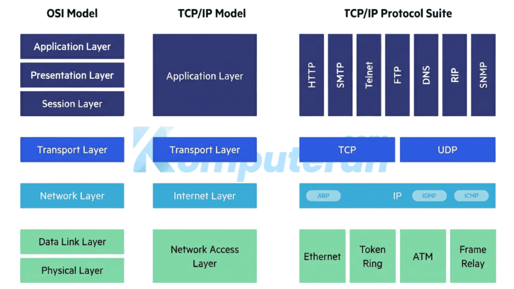 Pada model OSI, Link Layer mencakup Data Link Layer dan Physical Layer. Itu berarti TCP/IP menggabungkan dua fungsi OSI menjadi satu lapisan yang lebih sederhana, sehingga prosesnya lebih efisien dan mudah diterapkan di dunia nyata.
